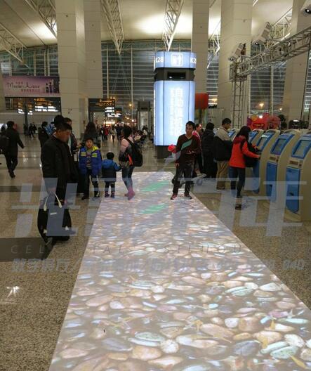 項目由深圳市光影百年有限公司與樂爾麗(ROLY)攜手打造,采用5臺樂爾麗RP-L7000X工程投影機(jī)在自助值機(jī)區(qū)打造了一套地面互動投影系統(tǒng)。5臺投影機(jī)向地面投射,通過融合,拼接成一張?zhí)煲聼o縫的畫卷。這套系統(tǒng)擁有多種互動形式,如水波紋、翻轉(zhuǎn)、碰撞、擦除、避讓、跟隨等,乘客可以通過身體動作與地面的圖像進(jìn)行互動。比如,走過之處水波隨之綻開,或者冰面開裂,或者有小魚全程追隨……