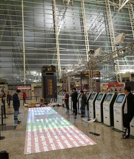 白云機(jī)場引進(jìn)了先進(jìn)的互動投影系統(tǒng),項目由深圳市光影百年有限公司與樂爾麗(ROLY)攜手打造,采用5臺樂爾麗RP-L7000X工程投影機(jī)在自助值機(jī)區(qū)打造了一套地面互動投影系統(tǒng)。5臺投影機(jī)向地面投射,通過融合,拼接成一張?zhí)煲聼o縫的畫卷。