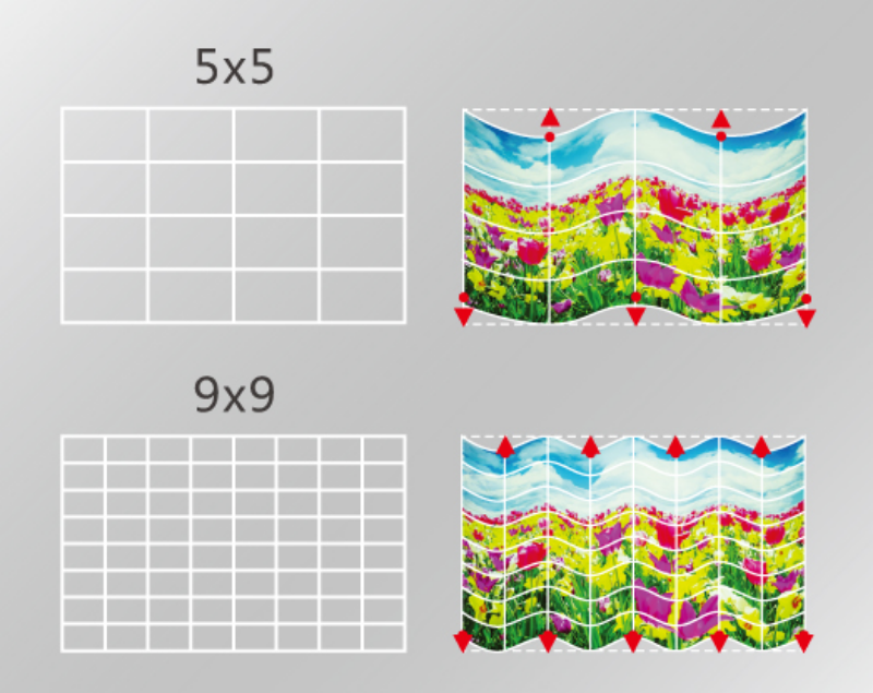 除了曲面校正外,還可以選擇5x5和9x9進(jìn)行多點校正,此功能可以讓您使用遙控器調(diào)整特殊屏幕如不規(guī)則或波形墻面,搭配特殊展覽展示進(jìn)行更多有趣的創(chuàng)意投影。
